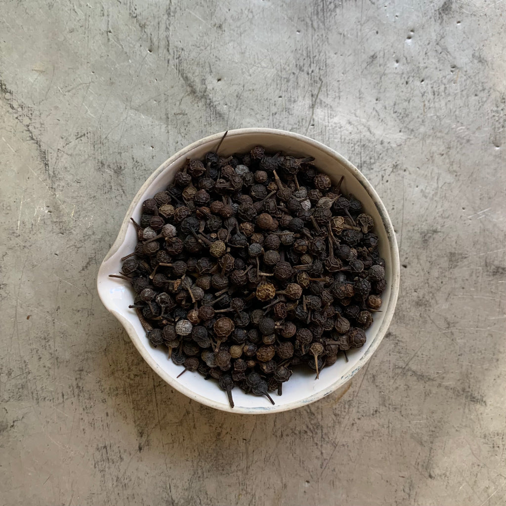 Piper cubeba, Cubeb or tailed pepper is a plant in the genus Piper, cultivated for its fruit and essential oil. It is mostly grown in Java and Sumatra, hence sometimes called Java pepper. Cubeb Peppercorns have notes of nutmeg & allspice, and are often used in the gin distillation process.